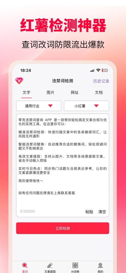 零克查词小红书检测是一款专门针对小红书平台打造的违禁词查询工具,整合了小红书平台各类危机敏感词数据资源,通过一键搜索查找可以快速诊断出文章中的敏感信息,并且系统会给出预警,按照不同的敏感危险程度进行颜色分级,为创作者提供更多快捷的优化选择,能更加直观的看到自己作品里的敏感内容从而能有效避免被平台限流,软件还支持笔记、表情等各种数据的敏感查询,在查询结果出来后也会提供对应的解决替换方案,帮助创作者们高效的处理自己的文本内容。