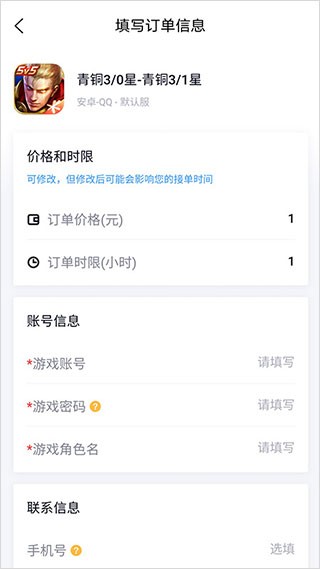 2.发单需选择对应游戏与区服,填写代练要求、账号信息等内容,提交后即可等待匹配优质服务。