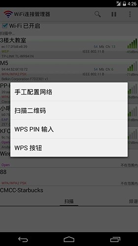 3.扫描列表会清晰列出每个热点工作的具体频段是2.4GHz还是5GHz,且标注出其正在使用的无线电信道编号。