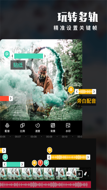 1、支持视频、音频、素材多轨同步编辑,搭配时间轴拉伸功能,精细剪辑轻松实现。
