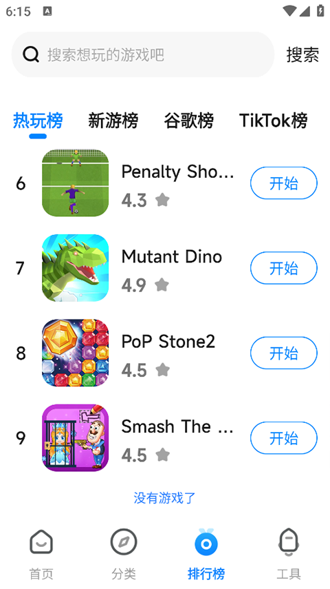 3.在这里用户点击【排行榜】,可以看到热门的游戏,进入游戏详情页点击试玩或获取按钮,按提示完成流程即可启动体验。