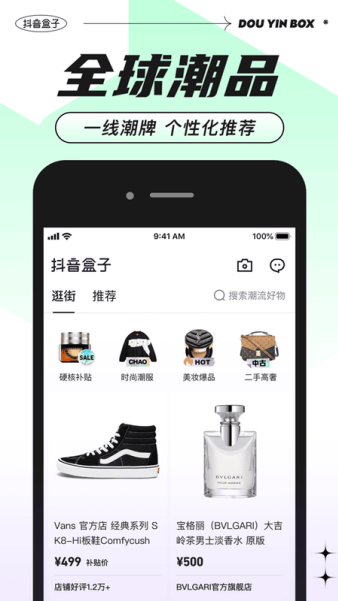 抖音盒子是字节跳动推出的独立潮流时尚电商App,用户数据、商品资源、账号体系全面互通,此前在抖音浏览商品的记录可同步至抖音盒子,抖音小店商家无需额外入驻,店铺会自动同步至平台。软件主打潮流时尚定位,涵盖街头文化、高端时装、彩妆护肤、穿搭好物等多元品类,结合用户兴趣标签与浏览习惯,精准推送潮流好物、穿搭视频与直播内容,实现货找人,首页刷潮流短视频与直播,看到心仪好物可直接点击商品链接,查看详情后一键下单!