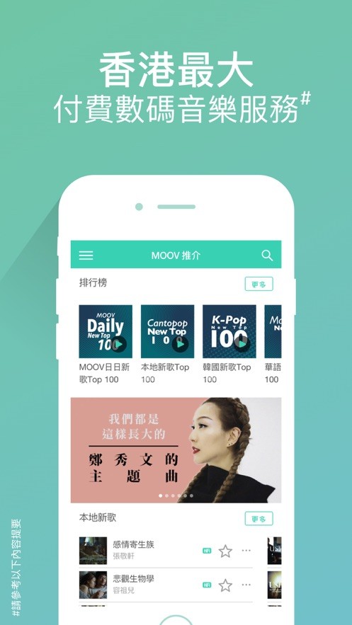 MOOV音乐中文版致力于为乐迷打造高品质、多平台的沉浸式音乐体验。融合24bit无损音质、独家音乐会现场、智能音乐推荐及音乐治疗等多元功能的综合性音乐平台,拥有香港丰富的广东歌库,包含华语、欧美、J-Pop等全球热门音乐,还开创音乐自疗功能,由专业注册音乐治疗师定制歌单并搭配广东话声音导航,将音乐体验拓展到心灵疗愈领域。MOOV Live独家音乐会模块为用户提供未出碟新歌的现场演绎版本,让乐迷与偶像的距离更近。支持智能手表直接播放,不用随身携带手机也能享受音乐自由。