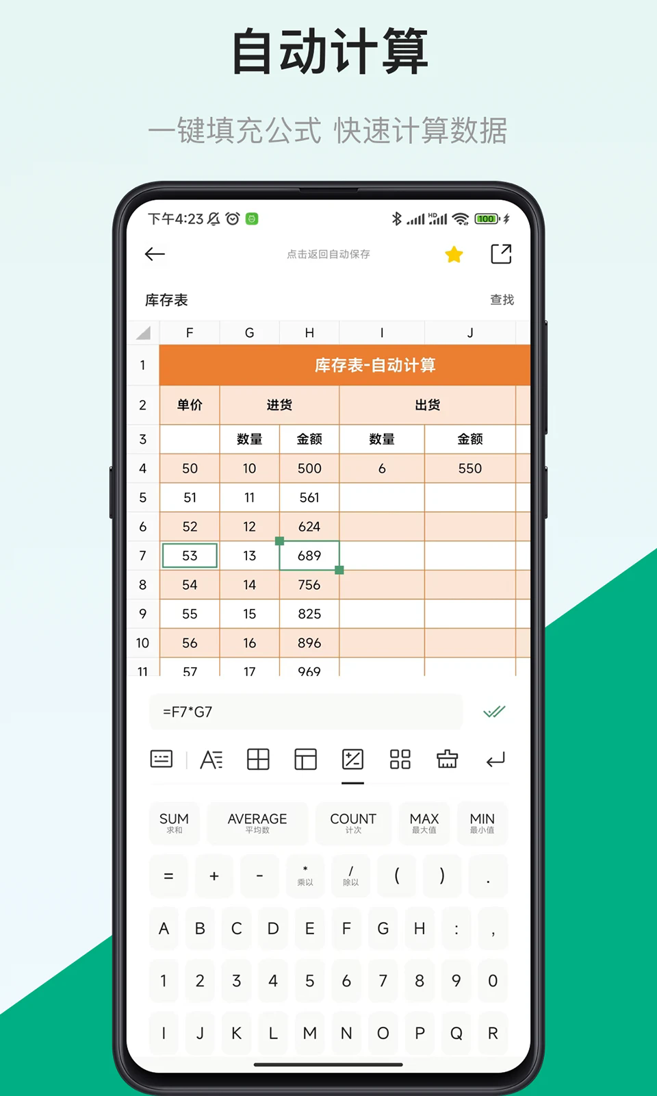 5. 数据统计功能支持求和、平均值、最大值、最小值计算,可快速分析表格数据。