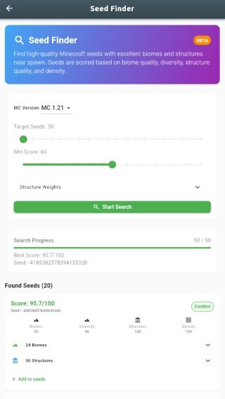 seedmap是一款实用且功能全面的我的世界游戏地图工具,你可以轻松查看游戏世界的详细地图,发现隐藏的地点和资源。可以在seedmap游戏工具中精准标记重要位置,规划最优探索路线,提升游戏效率。拥有丰富的地图图层和筛选功能,帮助你快速找到所需信息。在广阔的游戏世界中不再迷失方向,轻松掌握每一个角落。使用seedmap来高效利用地图资源,制定合理的游戏策略。让你能进行精彩的游戏探索任务,带来精彩欢乐的时光。