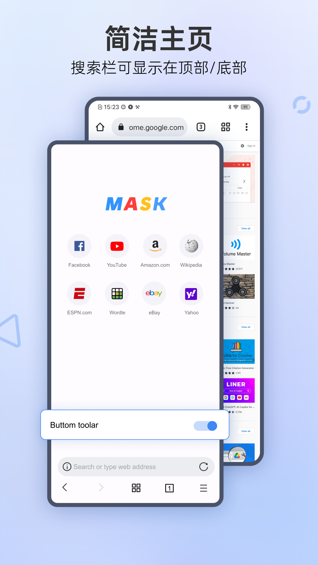 mask浏览器最新版是一款深度定制的安卓端移动浏览器,将桌面级浏览器的扩展能力与隐私保护机制完整迁移至移动端。用户可以直接在手机端安装并使用AdBlock、Tampermonkey、Dark Reader等各类实用插件,打破了移动浏览器功能单一的局限。它提供了强化版的无痕浏览模式、HTTPS强制加密以及反跟踪技术,确保用户的浏览数据与历史记录不被恶意采集。mask浏览器最新版进一步优化了界面交互逻辑,支持搜索栏位置自定义、全局暗黑模式以及多标签页管理,配合内置的网页翻译与广告拦截功能。
