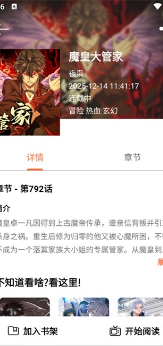 2、点进漫画后能看简介和章节,还能一键加入书架或直接开始阅读。
