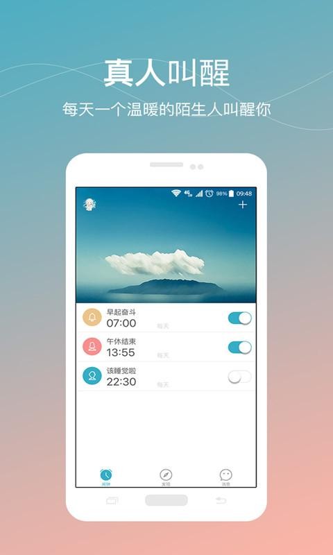 1、提供独具魅力的真人语音叫醒服务,给你更为有趣的叫醒体验。