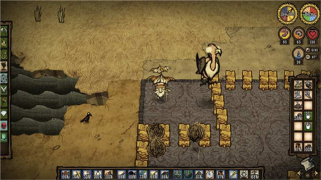 2、沿途收集燧石、干草等基础材料,尽早制作工具,提升采集效率,同时避开沼泽、蜘蛛巢穴等危险区域。