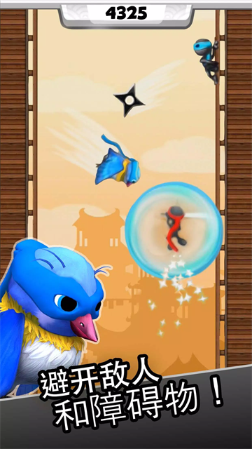 忍者跳跃豪华版是一款主打高空攀爬与跳跃的动作类游戏,游戏以竖屏跑酷为核心,忍者会自动向上攀爬,玩家通过点击屏幕操控角色在两面墙壁间来回跳跃,过程中需灵活躲避飞鸟、松鼠、飞镖、炸弹等各类障碍,还要挥刀击败拦路的敌人与海盗、巫医等特殊对手。收集不同道具能触发专属变身效果,变身为巨型飞镖清剿沿途障碍,助力攀爬更高高度。游戏以高分挑战为核心目标,难度会随攀爬高度逐步提升,搭配精致的画面与动感的音效,为玩家打造出紧张又充满趣味的沉浸式冒险体验,每一次尝试都能带来全新的挑战与成就感。