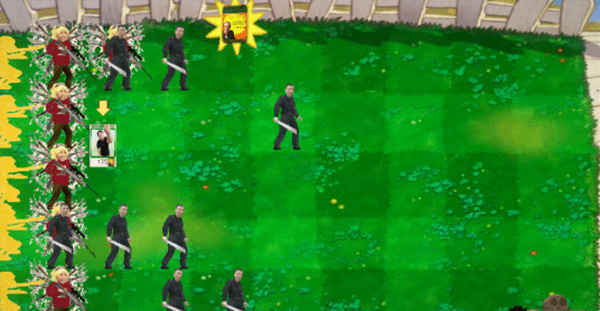 3.拖动卡片到右侧绿色的方块草坪上,合理的布局,有效阻止明星僵尸们的进攻,第一排和第二排建议如图示放置,运用爆发性植物技能,在僵尸扎堆或关键防线告急时使用,快速清除威胁,避免防线崩溃。