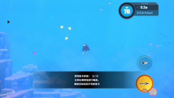 3.首先玩家需潜入蓝洞,可使用右侧刀的按钮攻击,接着跟随引导使用鱼叉进行捕鱼;