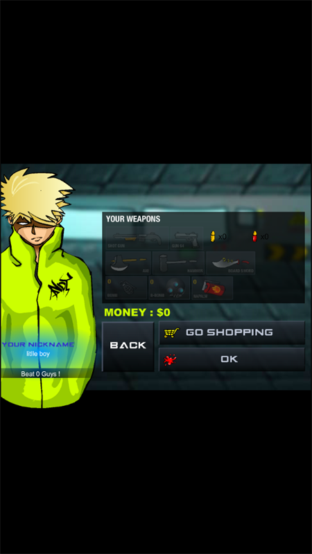 1.因为,游戏比较暴力血腥,所以说必须超过18岁才能够游玩,选I AM OVER 18,接着,我们再选择START,战斗开始之前,我们可以购买相应的武器道具,我们目前没有钱,只需点击OK即可。