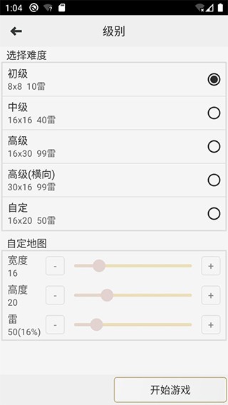 • 中级:16×16格,40雷,密度15.6%,平均通关时间5-15分钟