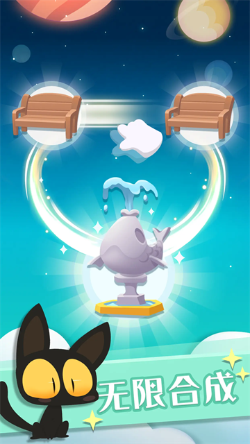 3.通过合成玩法解锁各类装饰与建筑,合理规划星球空间,打造集休闲、娱乐、生活于一体的喵星家园。