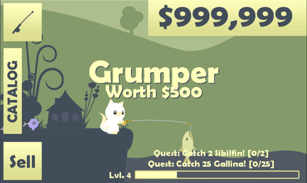 2.钓到鱼后,长按手机屏幕,就可以把鱼钓上来,钓到鱼的话则会获得大量金币,点击左下角的【sell】出售可获得金币,快速积累金币资源,尽早解锁基础的装备升级,提升垂钓的能力。