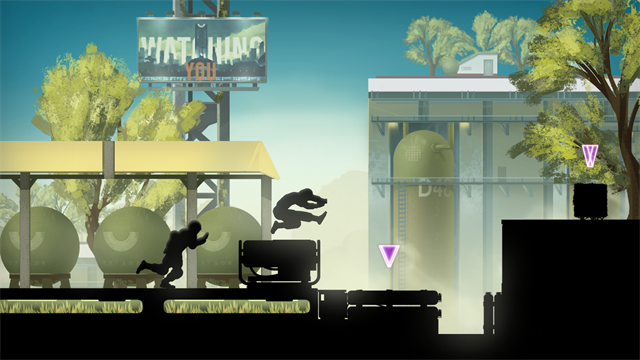 4.主角现在这个位置的后面是一段加速的路,路的尽头是一个墩,也就是图中最左边那一点点高的东西(截图不完整),在这段路加速后差不多到墩的时候要向左划一下屏幕减速,然后跳刀墩上再起跳(图中的动作),去到前面那个人那段路,大概到那块公告牌的位置,向下划一下屏幕去到这关的第二个隐藏场景。