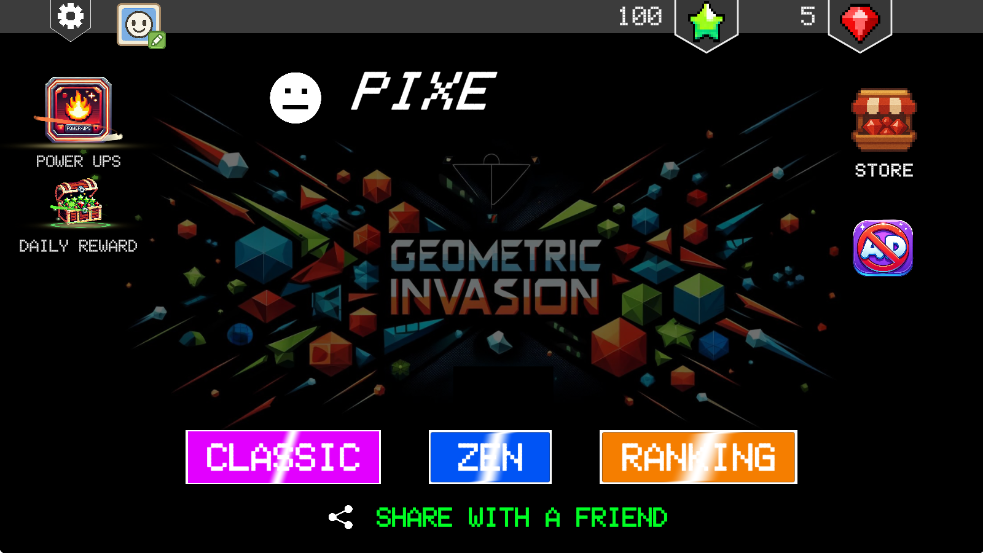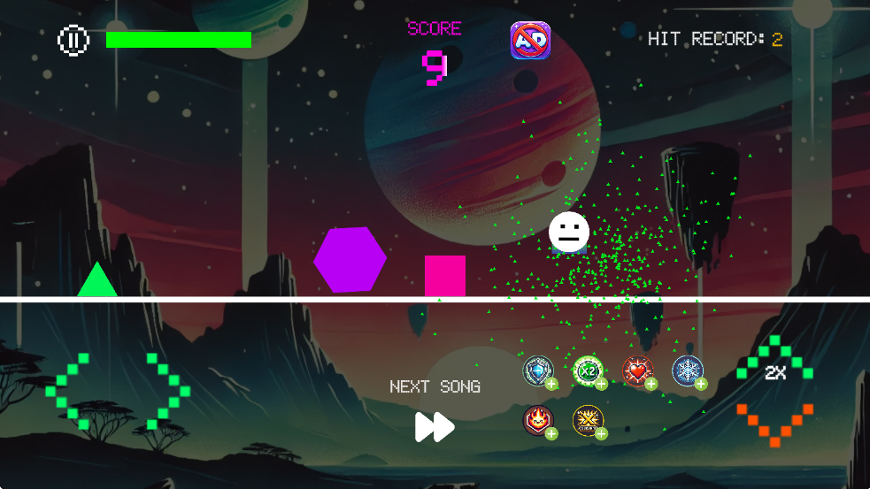 1、视觉风格采用基础像素角色与华丽动态几何特效背景结合,形成简洁与绚烂的独特反差美学。